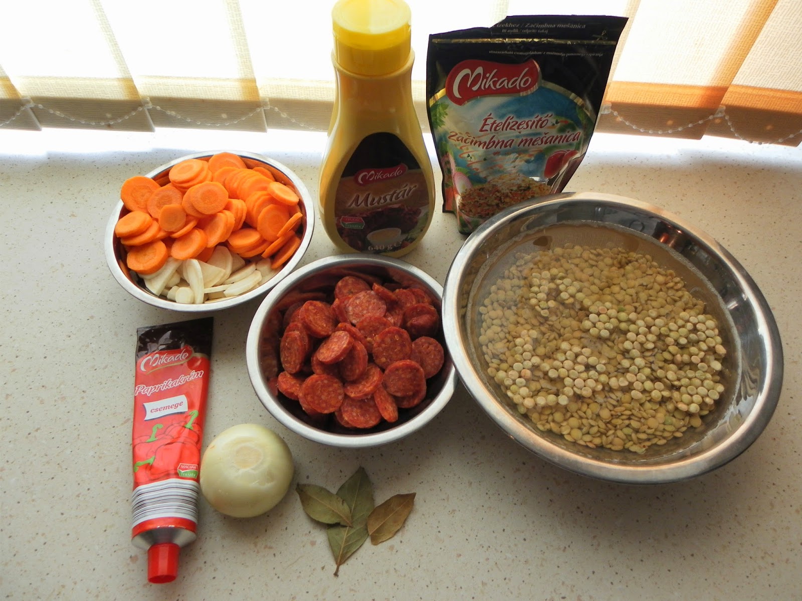 A lencsét egy napra hideg vízbe áztatjuk, a minimum a 3-4 óra. A hagymát apróra vágjuk majd a forró olajon megfuttatjuk, hozzáadjuk a karikára szeletelt sárgarépát és petrezselyemgyökeret és tovább pirítjuk vele. Egy evőkanál liszttel meghintjük és jól összekeverjük, hozzáadjuk a csemege paprikát majd összekeverés után felöntjük tetszőleges mennyiségű vízzel, én 2-3 litert használok. Hozzádobjuk a babérlevelet, belekeverjük a mustárt, keveset melegítjük, majd hozzákeverjük a lecsöpögtetett lencsét. Egyszer felforraljuk, majd lefedve egész alacsony tűzön puhára főzzük a zöldségeket.