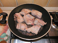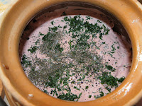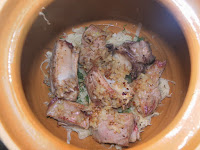 A húsokat nagyobb darabokra szeleteltjük és forró zsiradékon hirtelen átsütjük, egyik oldalát sózzuk borsozzuk sütés közben. Közben az apróra vágott hagymát szintén zsiradékon aranybarnára fonnyasztjuk. A savanyú káposztát ízlés szerint átmossuk majd a cserépedény aljára terítünk egy réteget belőle. Csomborra, az apróra vágott kaporra jól megszórjuk, sózzuk, borsozzuk. Ráfektetünk egy adag húst, majd egy kevés paradicsomlevet csurgatunk rá, és rákanalazunk egy adag fonnyasztott hagymát.(Én a tejföllel összekevertből tettem közé.) Ezt megismételjük annyiszor amennyi alapanyagunk van, de a végén a tetejére káposztának kell kerülnie. Erre ráöntjük egyben a megmaradt tejfölös paradicsomlevet majd sütőben lefedve 2 óra alatt puhára pároljuk. Tejföllel és friss paradicsom, paprikával tálaljuk.