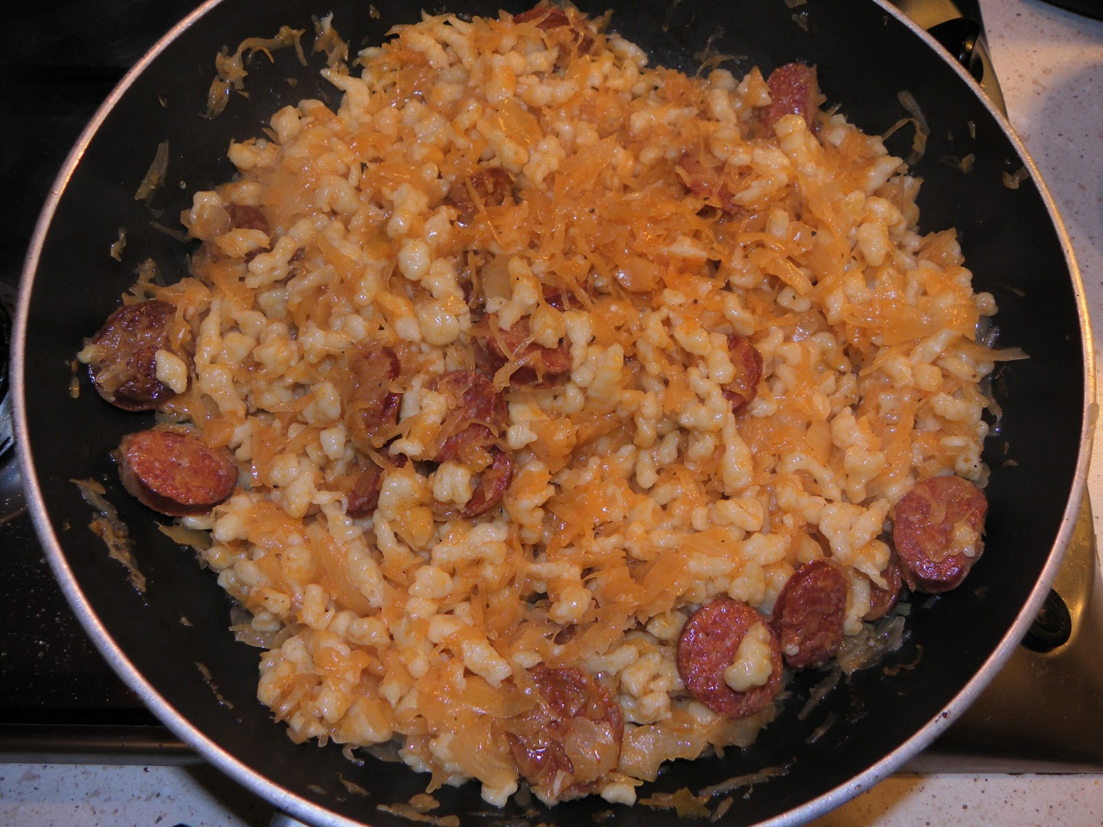 Elkészítjük a nokedli alapot majd megszaggatjuk. Miközben fő előkészítjük a többi hozzávalót is. A savanyú káposztát apróra vágjuk (ízlés szerint ha kell mossuk ki a fölös sós lét belőle), a fele kolbászt felkarikázzuk a többit 4 nagyobb darabra vágjuk és bevagdaljuk. A kolbászt lassú tűzön óvatosan zsírjára sütjük, majd ha elkészült a nagyobb darab kolbászokat félretesszük, a maradékba rádobjuk az apróra darabolt hagymát és megdinszteljük. Ahogy kész hozzáadjuk a savanyú káposztát, a szétnyomott fokhagymát, borsozzuk beleöntjük az 1 bort (ezt lehet helyettesíteni vízzel is, ha jó ízes a káposzta). Negyed óra alatt készre pároljuk az egészet. Az elkészített nokedlit ráhalmozzuk a káposztás kolbászra, jól összekeverjük, majd egy tűzálló tálba tesszük. Negyed órára behelyezzük a sütőbe 200 fokra és megpirítjuk a tetejét. Tálaláskor a félretett nagyobb kolbászokkal díszítjük.