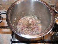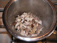 A hagymát finomra felaprítjuk, majd a vaj és az olívaolaj keverékén a felcsíkozott szalonnával együtt pirítani kezdjük. Felkockázzuk a sertéslapockát, körülbelül 2×2 cm-es darabokra és hozzákeverjük a hagymához, hagyjuk kicsit főni saját levében. A gombát megmossuk és felcikkezzük, majd a húshoz adjuk.