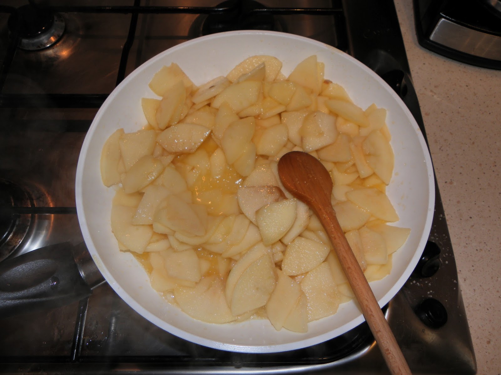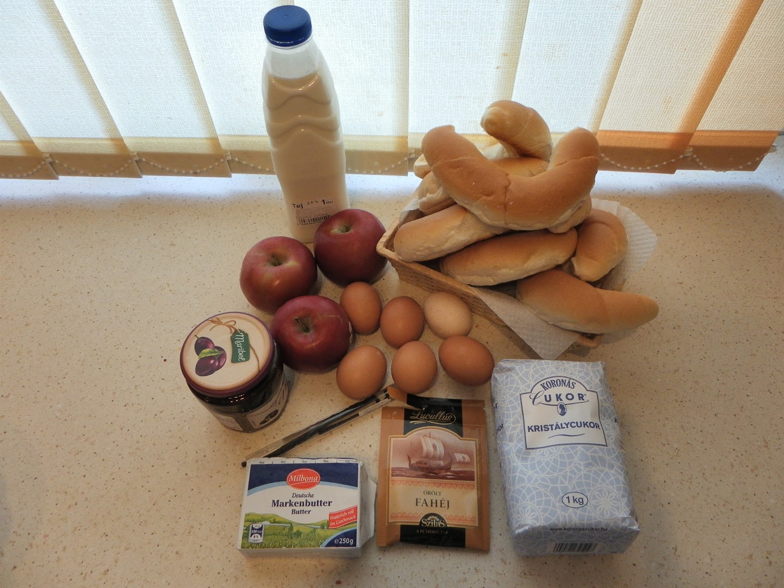 A tojásokat kettéválasztjuk, a sárgáját a cukorral és a vaníliával eldolgozzuk, majd hozzáadjuk a tejest is. A fehérjét félretesszük. Felkarikázzuk a kifliket, és az összekevert sárgáját ráöntjük a kiflikre, alaposan összekeverjük velük, de ügyeljünk lehetőleg a kiflik ne essenek szét teljesen. Az almákat meghámozzuk, kimagozzuk, és vékony cikkekre vágjuk, majd egy serpenyőben vajon párolni kezdjük pár percig. Meghintjük a fahéjjal és két evőkanál cukorral és egy keveset karamellízáljuk.