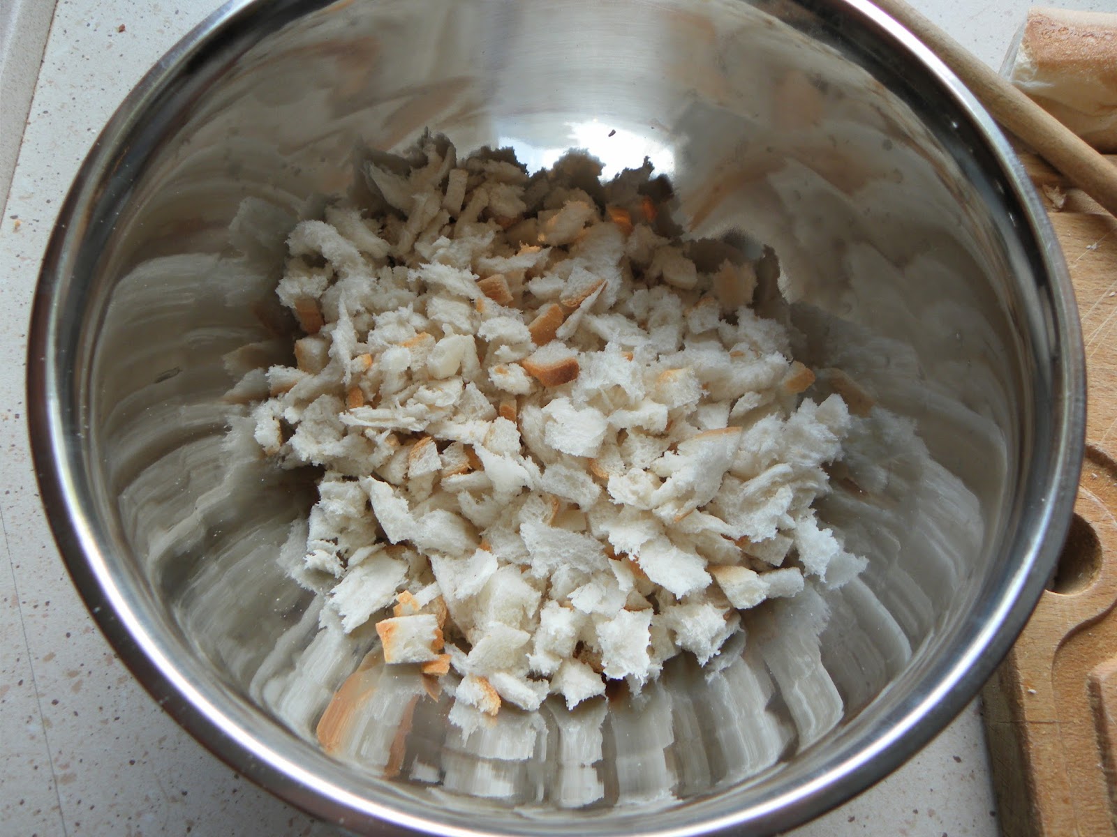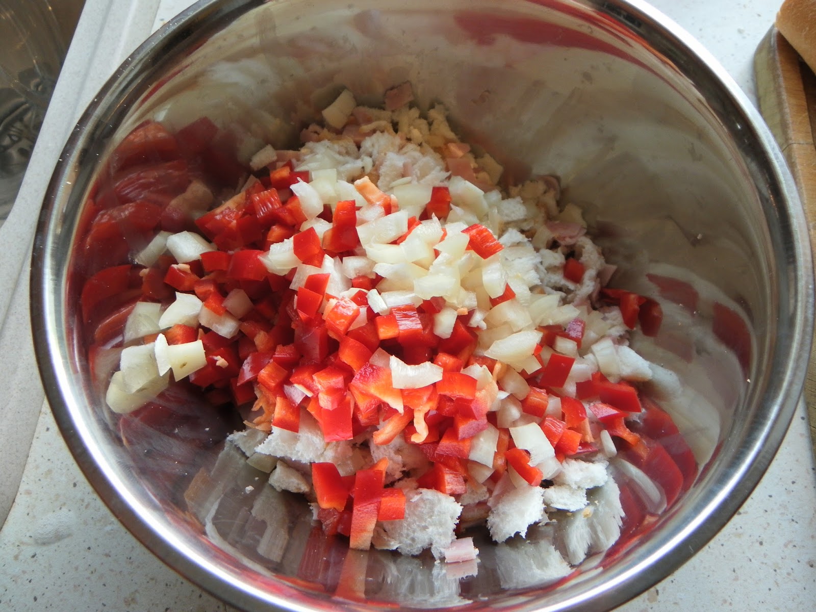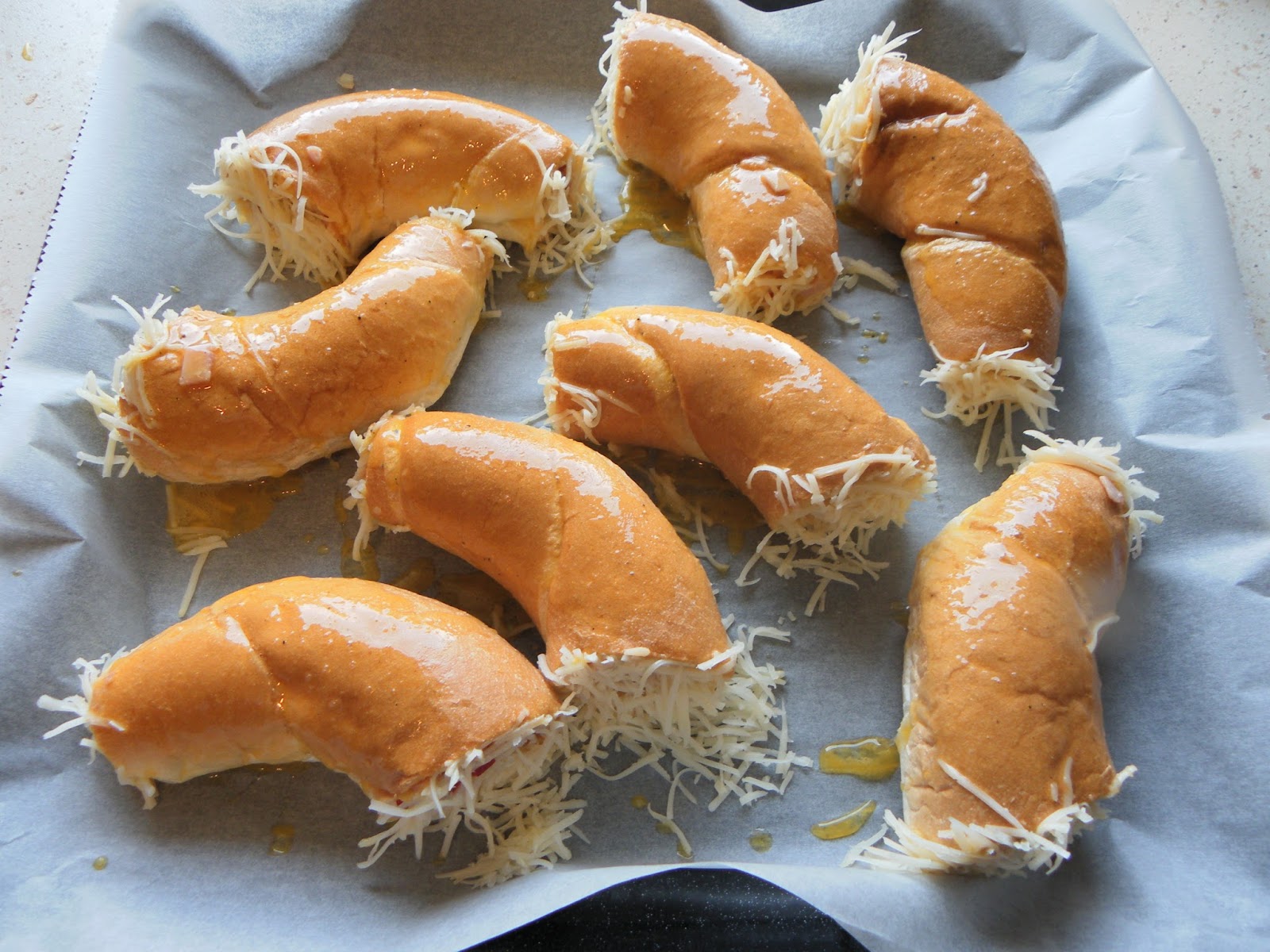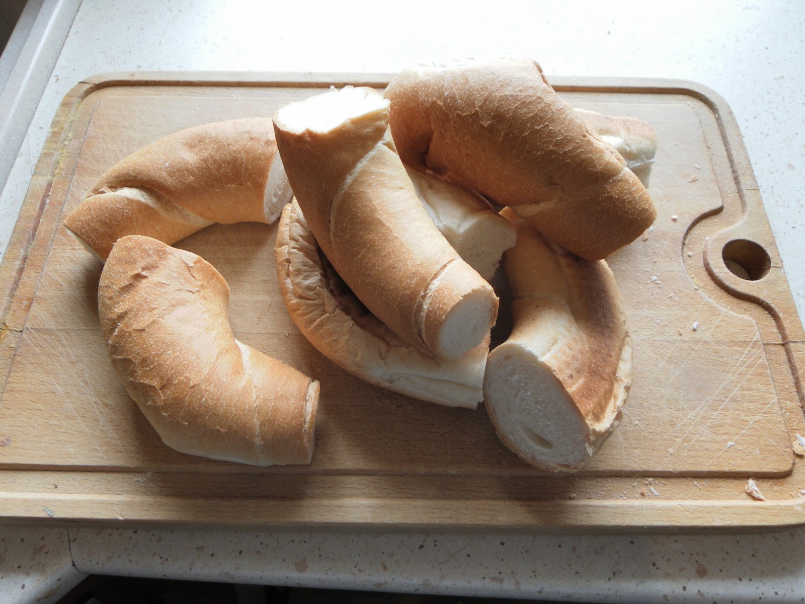 A kifliket kettévágjuk és a végüket szintén levágjuk. Egy fakanál nyelének a segítségével, kivájjuk a kiflik belsejét, majd a kiflibelet és a kiflik végeit, apró részekre daraboljuk, tépjük. A tölcsérré alakult kifliket megtöltjük az alábbi töltelékkel.