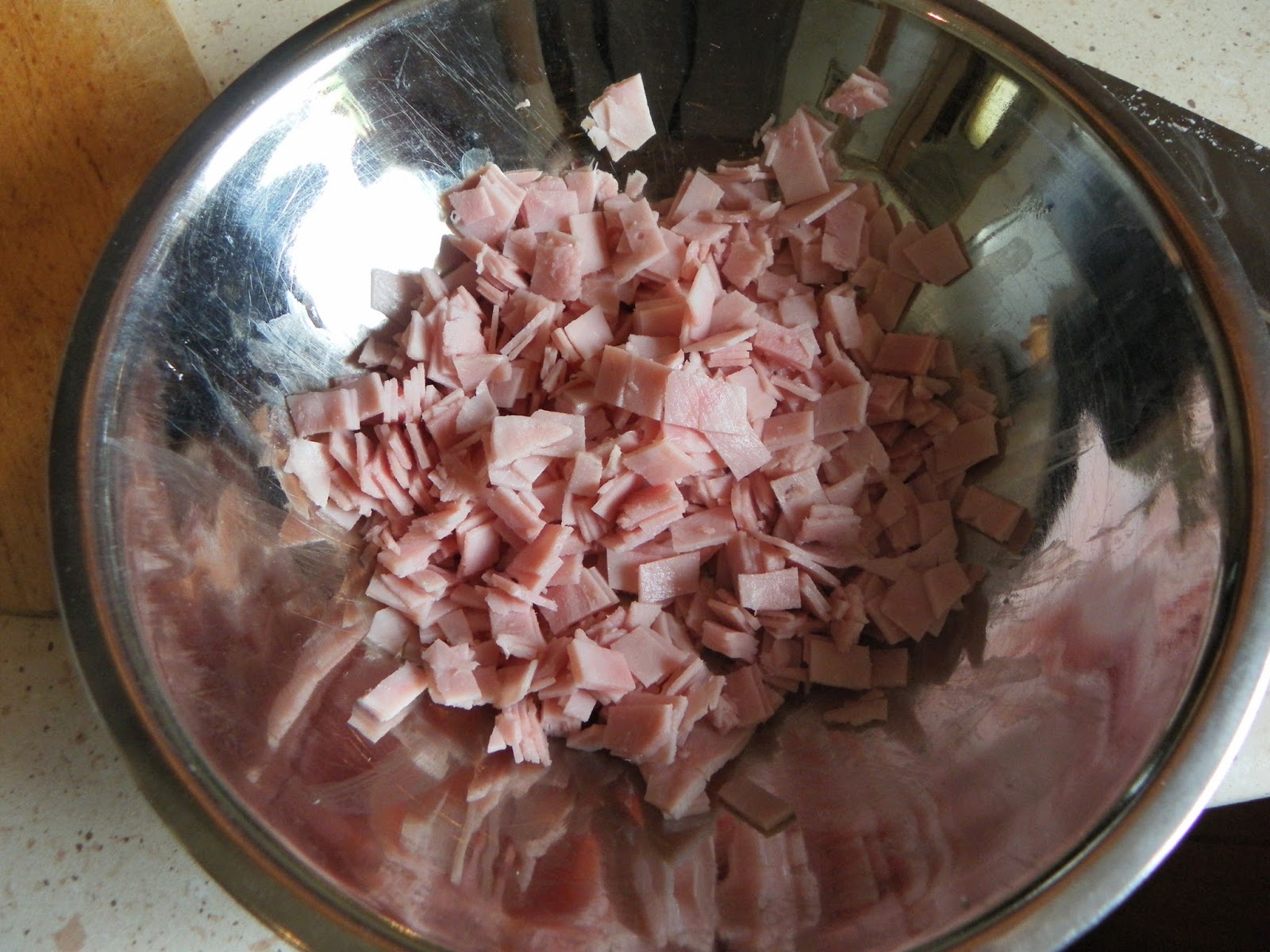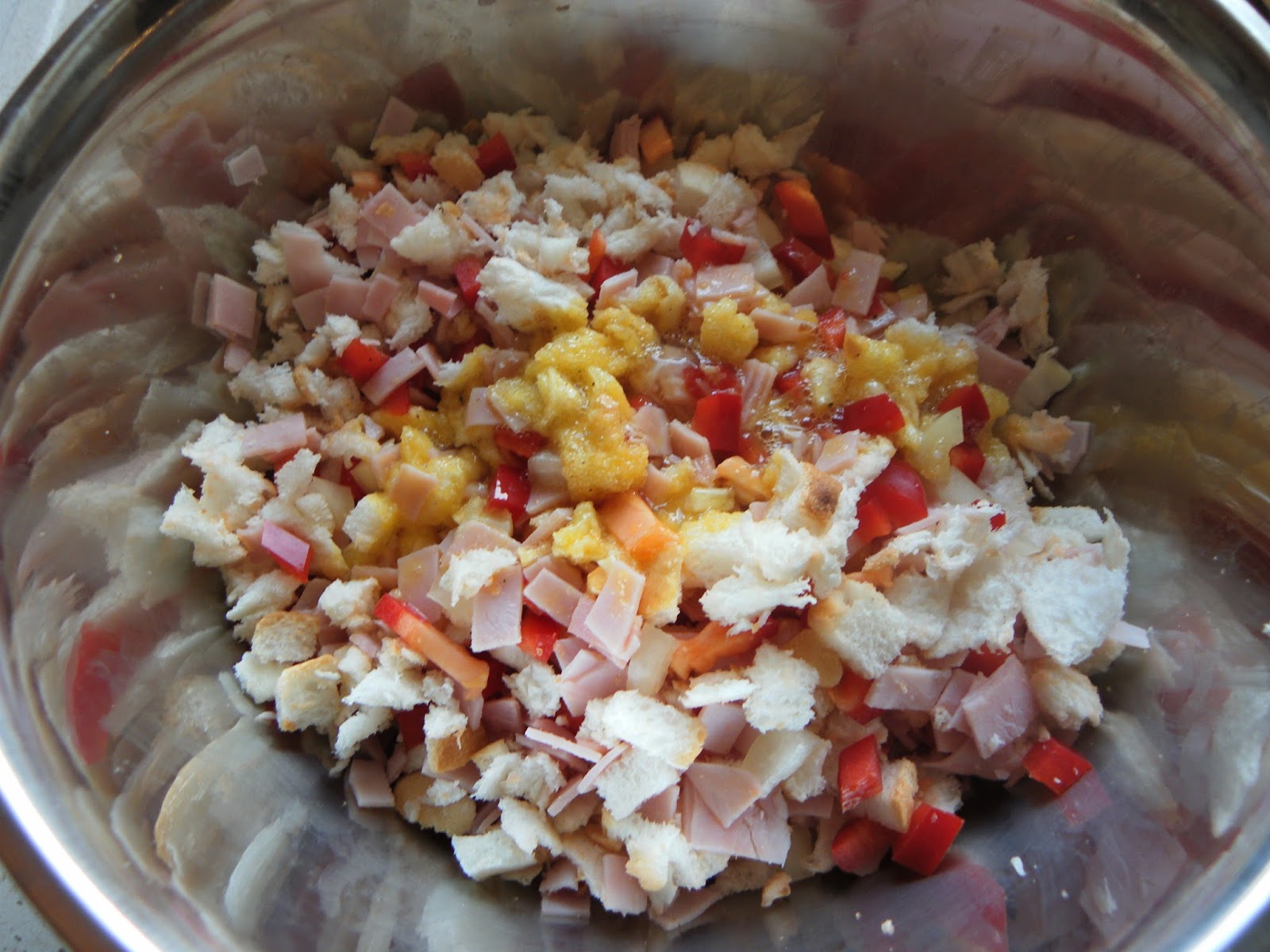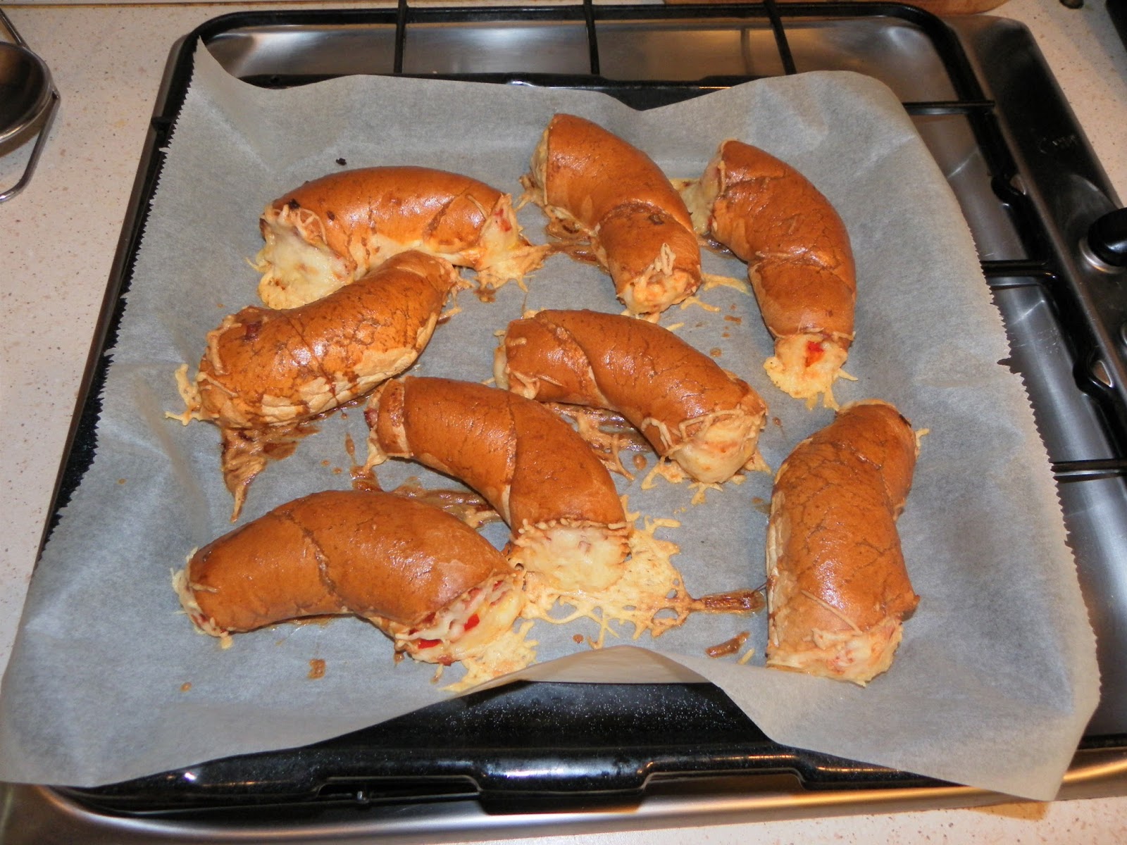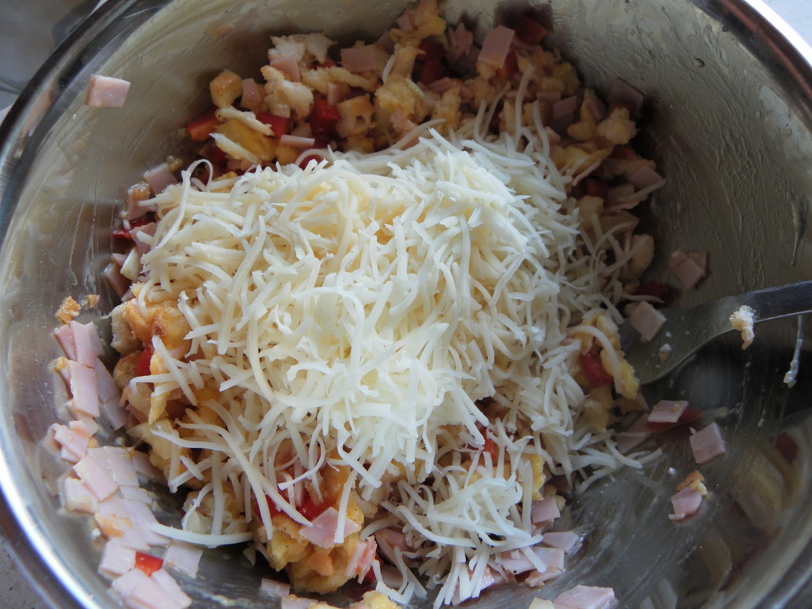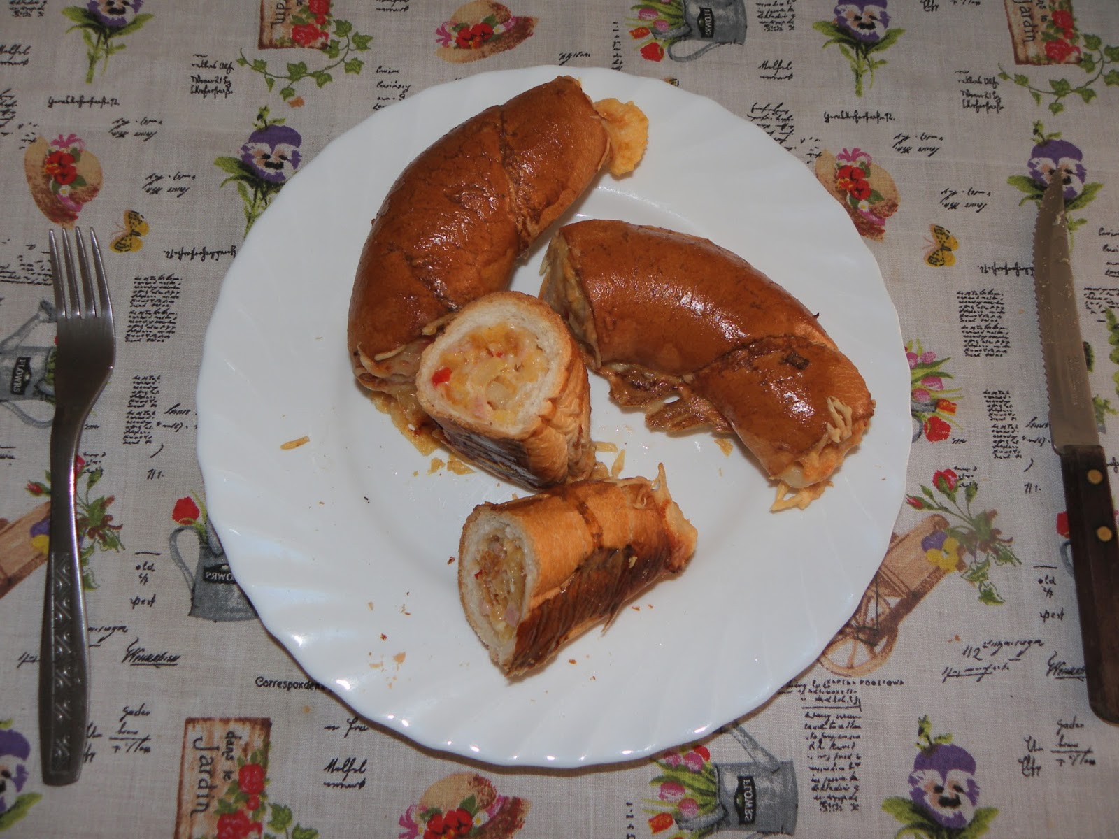 A kifliket kettévágjuk és a végüket szintén levágjuk. Egy fakanál nyelének a segítségével, kivájjuk a kiflik belsejét, majd a kiflibelet és a kiflik végeit, apró részekre daraboljuk, tépjük. A tölcsérré alakult kifliket megtöltjük az alábbi töltelékkel.