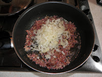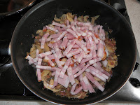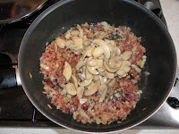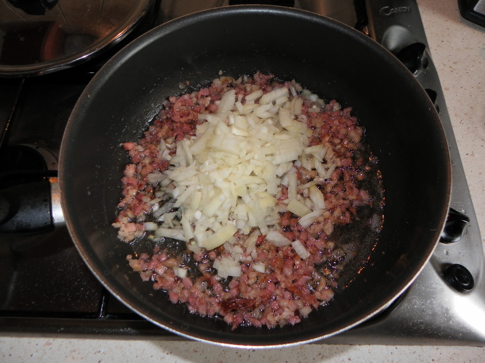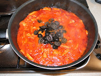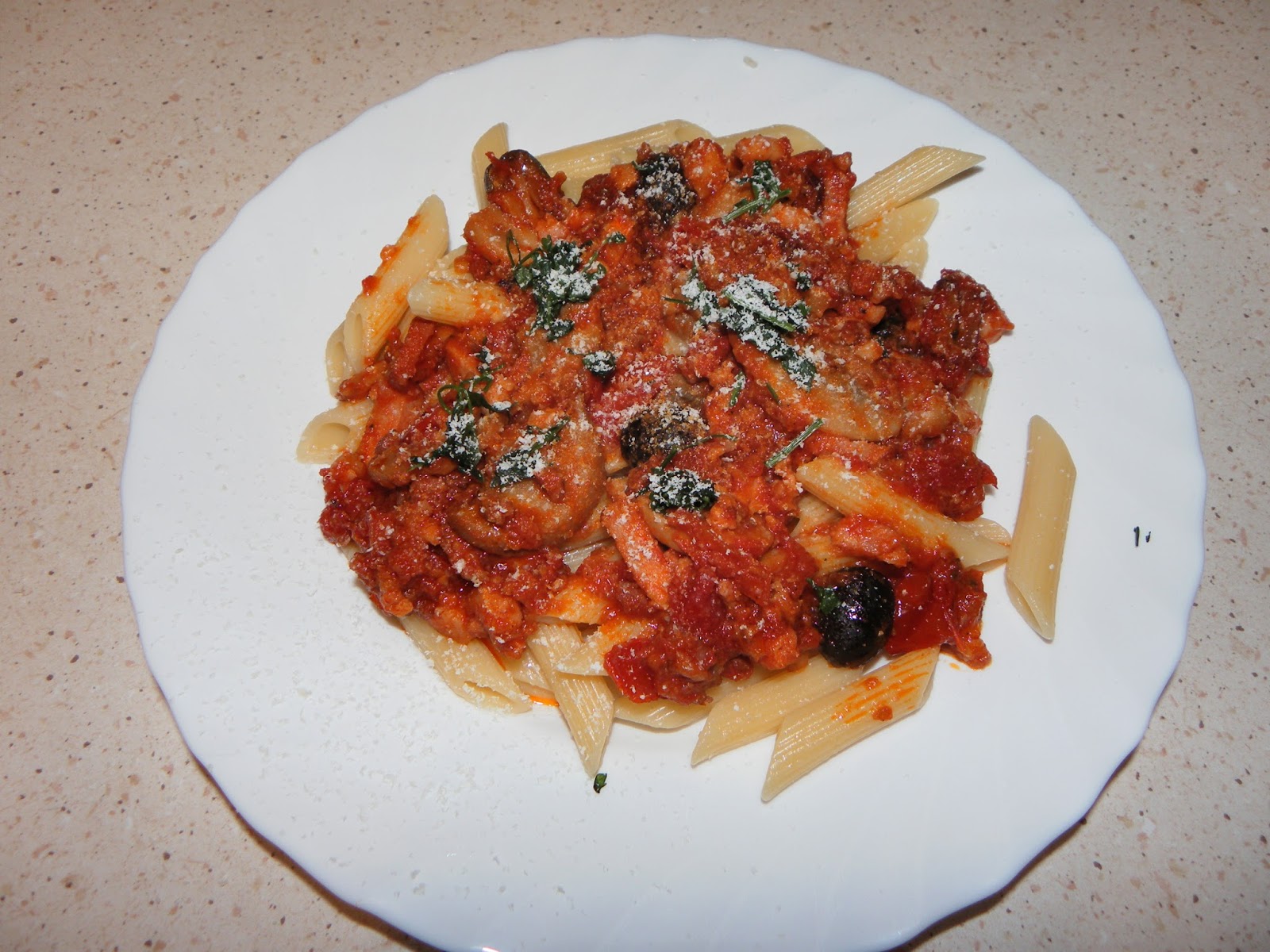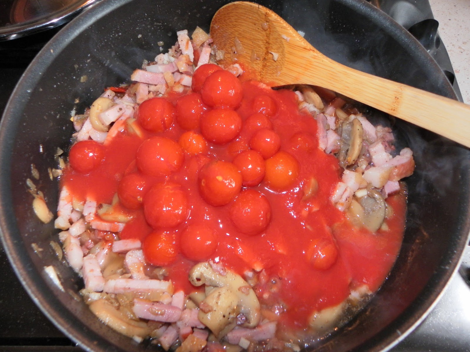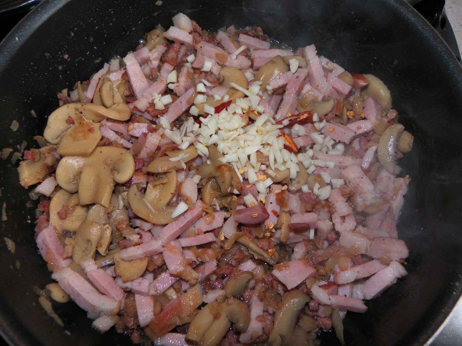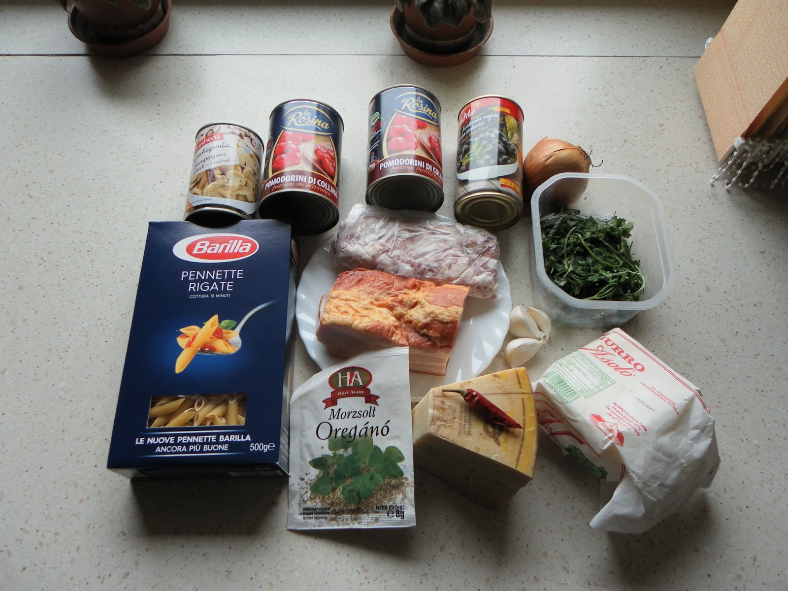 Feldaraboljuk a szalonnát csíkokra, miközben egy kis zsiradékon a kockázott bacont kissé megpítjuk, rádobjuk az apróra vágott hagymát és összedinszteljük. Rádobjuk a gombát (itt figyeljünk a konzerv hamarabb kész), a csíkozott szalonnát, az apróra vágott fokhagymát és a felvágott csilit, összekeverve kicsit főzzük. A két konzerv hámozott paradicsomot beleöntjük, sózzuk, borsozzuk és hozzáadjuk az oregánot is ízlés szerint, lassú tűzőn főzzük, majd amikor már majdnem kész beledobjuk a félbevágott fekete olívabogyót és készre főzzük. Friss penne tésztával tálaljuk petrezselyemmel megszórva és finom parmezánsajttal ráreszelve.