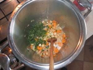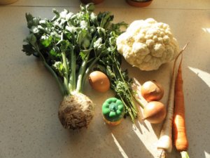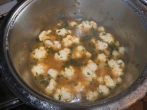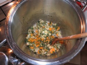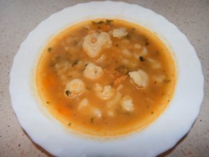 Meghámozzuk a zöldségeket és apróra kockázzuk. A vöröshagymát felaprítjuk, majd kevés zsiradékon az összevágott zöldségekkel együtt párolni kezdjük. Amikor félig megpuhult, megszórjuk a finomra vágott petrezselyemmel és két evőkanál liszttel. Egy percig kevergetve pirítjuk majd rászórjuk a pirospaprikát, átkeverjük majd felöntjük 2 liter vízzel és megsózzuk. Ha felforrt hozzáadjuk az apróbb rózsáira bontott karfiolt. amíg újra felfő, elkészítjük a paprikás nokedlit. Összekeverjük a tojást, a zsiradékot, egy kávéskanál pirospaprikát csipetnyi sóval és annyi liszttel amennyit felvesz. Viszonylag kemény tésztát készítünk, majd a felforrt levesbe szaggatjuk és összefőzzük a levest.