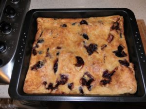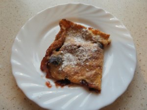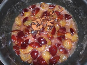 A sütőt előmelegítjük 200 fokra (180 fok légkeverés). A szilvát kimagozzuk és negyedekre vágjuk. Egy serpenyőben felolvasztjuk a vajat, majd amikor felhabzott hozzáadjuk a szilvát és a nádcukrot. Ha savanyúbb a szilva növeljünk a cukor mennyiségén. Hozzákeverjük félúton az őrölt fahéjat. Néhány percig pirítjuk, amíg a szilva kissé megpuhul a cukor meg elkezd karamellizálódni. Egy edényben összekeverjük a felvert tojásokat a tejjel és egy csipet sóval, majd szépen hozzákeverjük a lisztet. Nem kell túldolgozni, különben túl tömör lesz a palacsinta. A szilvát tálba öntjük majd a tetejére ráfolyatjuk a lisztes masszát és a sütőben 20 percig sütjük. Kis porcukorral meghintve tálaljuk, de várjunk kicsit míg egy kicsit kihűl.