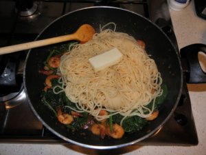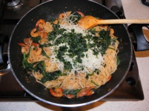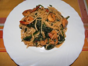 Feltesszük a spagettit vagy másfajta hosszú tésztát főzni, olajos sós vízben. Egy lábasban 2 evőkanál olívaolajon és egy cikk vajon elkezdjük a fokhagymát dinsztelni. Megszórjuk pirospaprikával, vagy száraz csilivel (ízlés szerint ki hogy kívánja) majd beleszórjuk a garnélát, sózzuk, borsozzuk és megpirítjuk benne. Rászórunk egy púpos teáskanál szárított oregánót majd egy két átkeverés után beledobjuk a spenótleveleket. Még mielőtt teljesen összeesne rádobjuk a lecsöpögtetett spagetti egy újabb cikk vajjal együtt. Megszórjuk a reszelt parmezánsajttal és a felaprított petrezselyem zöldjével. alaposan összeforgatjuk rácsavarunk egy negyed citrom levét ezzel is összekeverjük és már tálaljuk is. Tetejére még szórhatunk friss aprított petrezselyem zöldjét még díszítésként.