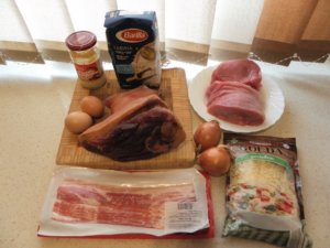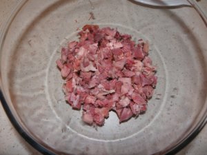 A csülköt előző nap főzzük puhára kb 1,5 óra alatt és hagyjuk a levében kihűlni., de lehet aznap is csinálni. Szeleteljük fel fel apró darabokra. A hagymát vágjuk apróra és dinszteljük meg kevés zsiradékon. A csülköt, a hagymát és a mustárt keverjük össze egy üveg tálban és tegyük félre. Az őzgerincformát vagy egy hasonló tálat, kenjük ki zsiradékkel, szórjuk meg zsemlemorzsával, majd a baconnel béleljük ki úgy, hogy mindkét oldalon túllógjon.