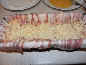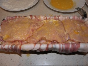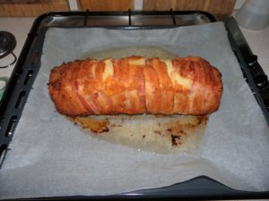 Szórjunk bele egy marék sajtot, majd a lisztbe és tojásba forgatott hússzeletekkel béleljük ki. Szórjunk rá újra sajtot, majd tömjük meg az elkészített csülkös töltelékkel. A tetejére újra tegyünk lisztbe, tojásba forgatott hússzeleteket. Hajtsuk rá a lelógó szalonnát, a maradékkal pedig a kilátszó részeket fedjük be. Az őzgerincformát a sütés közben esetlegesen kifolyó lé miatt tegyük egy nagyobb tepsire és süssük 180 fokon 1 órát. Ezután óvatosan egy késsel a széleket mozgassuk meg, hogy egy sütőpapíros tepsire ki tudjuk fordítani és a másik felét is pirosra tudjuk sütni kb 15 perc alatt.